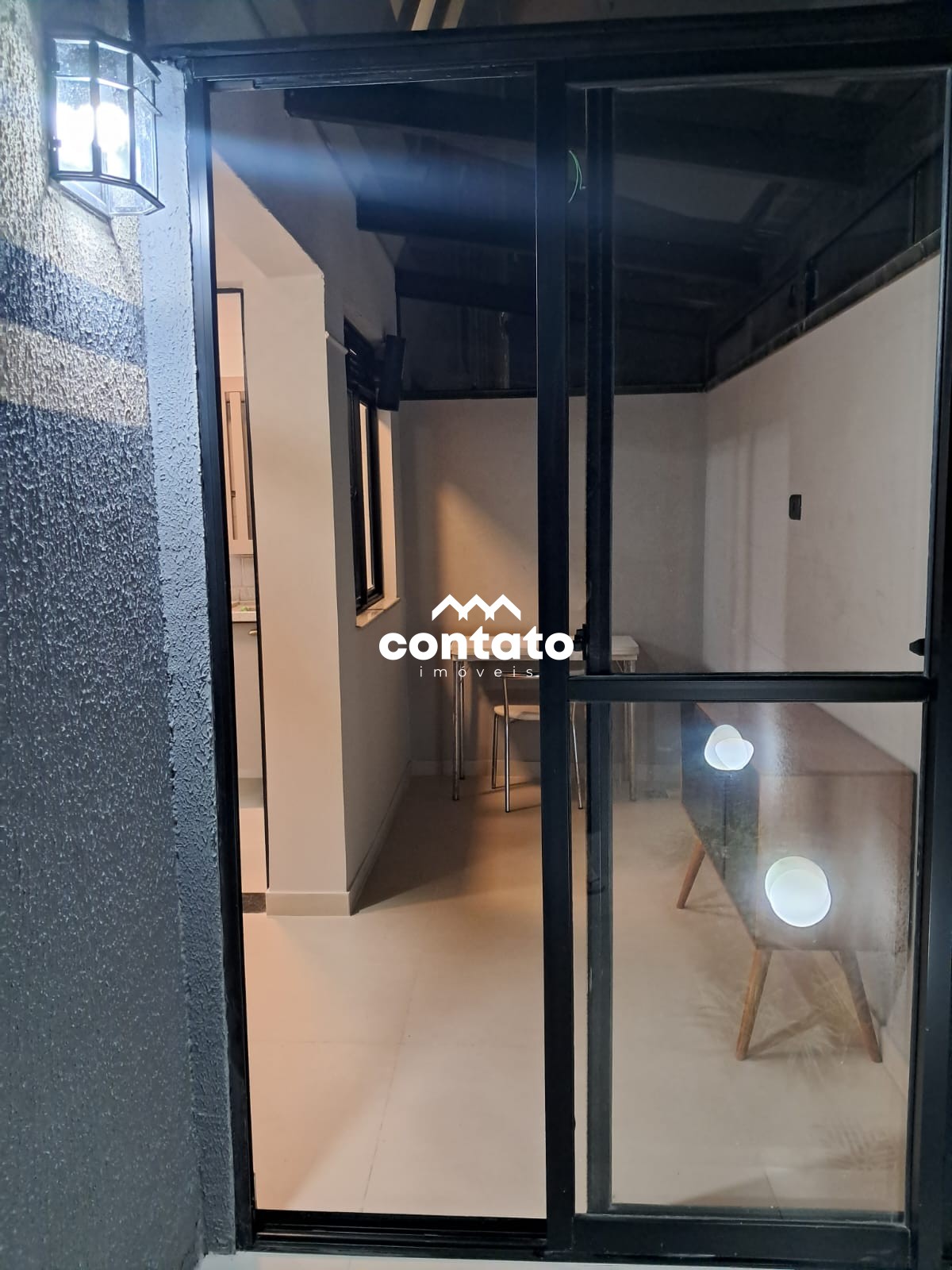 Sala integrada com a churrasqueira, área coberta com vidro.