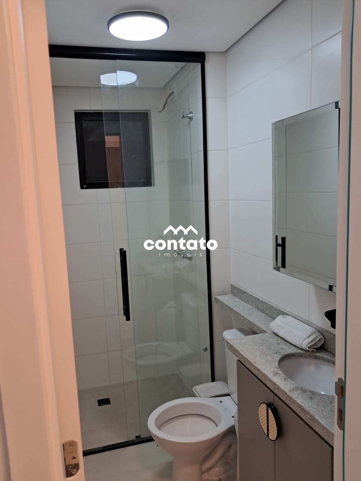 Box até o teto, banheiro com armários, pedra/torneira.