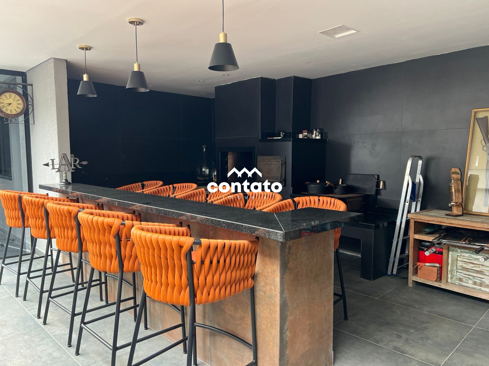 Espaço gourmet completo com churrasqueira, fogão a lenha, forno de pizza e pão