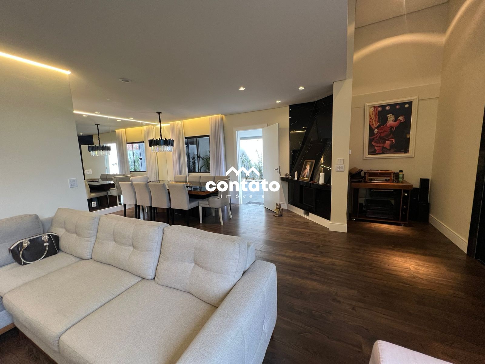 Sala de estar com pé direito alto, sala de jantar, espaçosa e iluminada